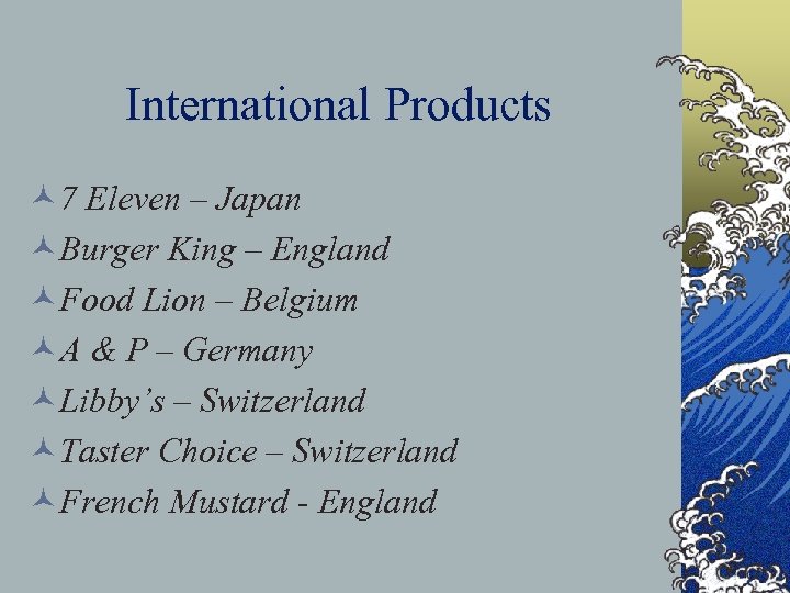 International Products © 7 Eleven – Japan ©Burger King – England ©Food Lion – Belgium ©A & P – Germany ©Libby’s – Switzerland ©Taster Choice – Switzerland ©French Mustard - England