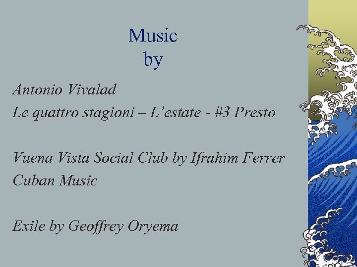 Music by Antonio Vivalad Le quattro stagioni – L’estate - #3 Presto Vuena Vista Social Club by Ifrahim Ferrer Cuban Music Exile by Geoffrey Oryema