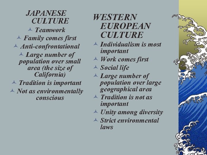 JAPANESE CULTURE © Teamwork © Family comes first © Anti-confrontational © Large number of population over small area (the size of California) © Tradition is important © Not as environmentally conscious WESTERN EUROPEAN CULTURE © Individualism is most important © Work comes first © Social life © Large number of population over large geographical area © Tradition is not as important © Unity among diversity © Strict environmental laws