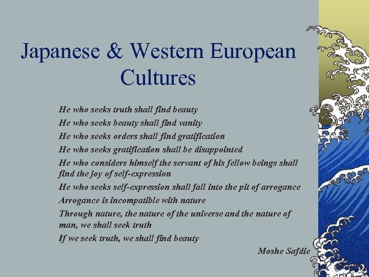 Japanese & Western European Cultures He who seeks truth shall find beauty He who seeks beauty shall find vanity He who seeks orders shall find gratification He who seeks gratification shall be disappointed He who considers himself the servant of his fellow beings shall find the joy of self-expression He who seeks self-expression shall fall into the pit of arrogance Arrogance is incompatible with nature Through nature, the nature of the universe and the nature of man, we shall seek truth If we seek truth, we shall find beauty Moshe Safdie