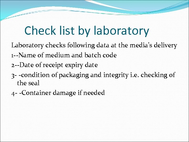 Check list by laboratory Laboratory checks following data at the media's delivery 1 --Name of medium and batch code 2 --Date of receipt expiry date 3 - -condition of packaging and integrity i. e. checking of the seal 4 - -Container damage if needed