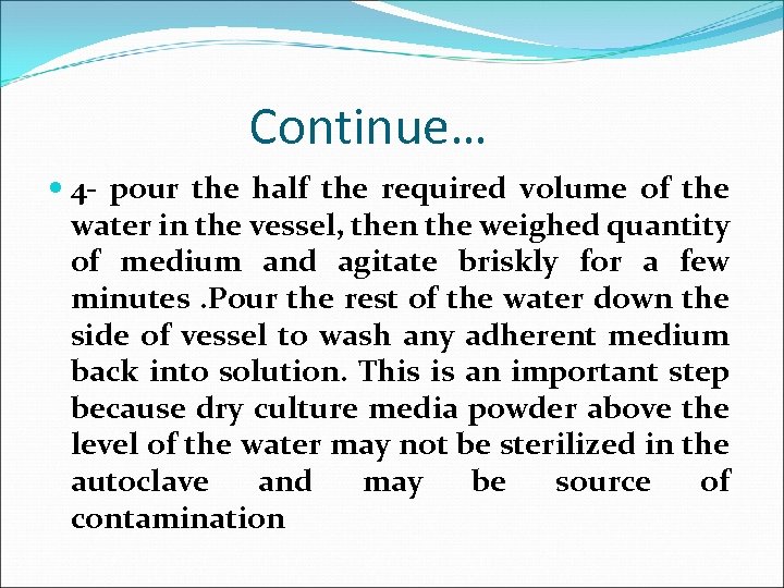 Continue… 4 - pour the half the required volume of the water in the vessel, then the weighed quantity of medium and agitate briskly for a few minutes. Pour the rest of the water down the side of vessel to wash any adherent medium back into solution. This is an important step because dry culture media powder above the level of the water may not be sterilized in the autoclave and may be source of contamination