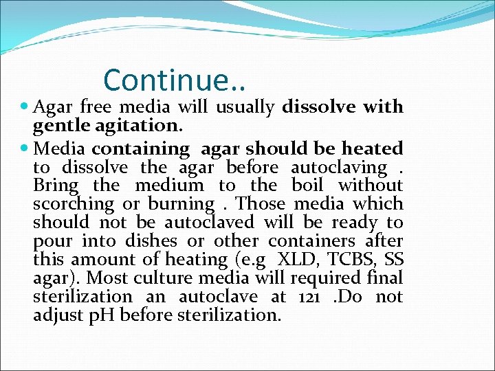 Continue. . Agar free media will usually dissolve with gentle agitation. Media containing agar should be heated to dissolve the agar before autoclaving. Bring the medium to the boil without scorching or burning. Those media which should not be autoclaved will be ready to pour into dishes or other containers after this amount of heating (e. g XLD, TCBS, SS agar). Most culture media will required final sterilization an autoclave at 121. Do not adjust p. H before sterilization.