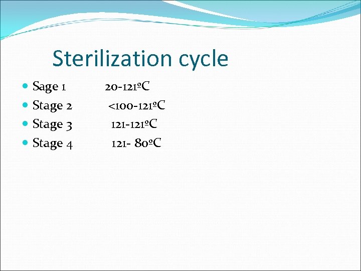 Sterilization cycle Sage 1 Stage 2 Stage 3 Stage 4 20 -121ºC <100 -121ºC 121 - 80ºC