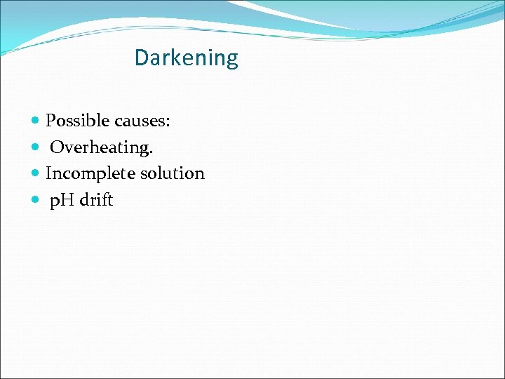 Darkening Possible causes: Overheating. Incomplete solution p. H drift