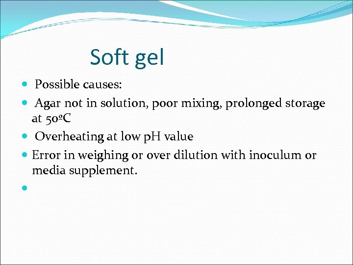Soft gel Possible causes: Agar not in solution, poor mixing, prolonged storage at 50ºC Overheating at low p. H value Error in weighing or over dilution with inoculum or media supplement.
