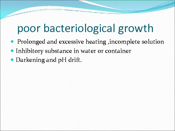 poor bacteriological growth Prolonged and excessive heating , incomplete solution Inhibitory substance in water or container Darkening and p. H drift.