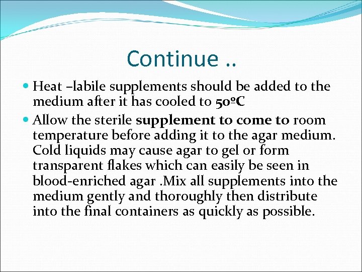 Continue. . Heat –labile supplements should be added to the medium after it has cooled to 50ºC Allow the sterile supplement to come to room temperature before adding it to the agar medium. Cold liquids may cause agar to gel or form transparent flakes which can easily be seen in blood-enriched agar. Mix all supplements into the medium gently and thoroughly then distribute into the final containers as quickly as possible.