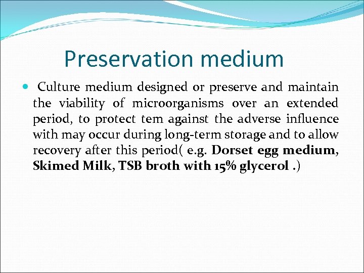 Preservation medium Culture medium designed or preserve and maintain the viability of microorganisms over an extended period, to protect tem against the adverse influence with may occur during long-term storage and to allow recovery after this period( e. g. Dorset egg medium, Skimed Milk, TSB broth with 15% glycerol. )