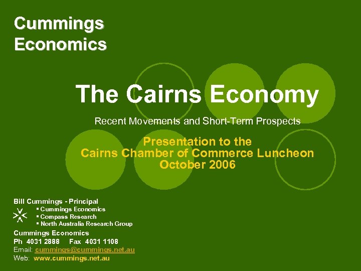 Cummings Economics The Cairns Economy Recent Movements and Short-Term Prospects Presentation to the Cairns Chamber of Commerce Luncheon October 2006 Bill Cummings - Principal § Cummings Economics § Compass Research § North Australia Research Group Cummings Economics Ph 4031 2888 Fax 4031 1108 Email: cummings@cummings. net. au Web: www. cummings. net. au