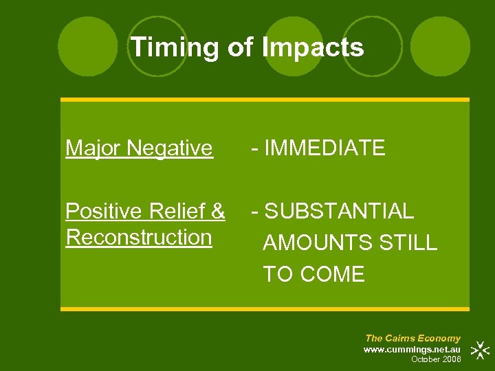 Timing of Impacts Major Negative - IMMEDIATE Positive Relief & Reconstruction - SUBSTANTIAL AMOUNTS STILL TO COME The Cairns Economy www. cummings. net. au October 2006