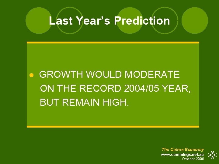 Last Year’s Prediction l GROWTH WOULD MODERATE ON THE RECORD 2004/05 YEAR, BUT REMAIN HIGH. The Cairns Economy www. cummings. net. au October 2006