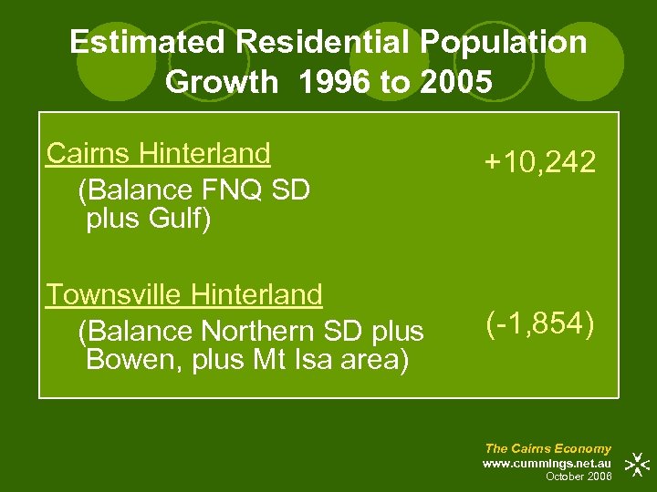 Estimated Residential Population Growth 1996 to 2005 Cairns Hinterland (Balance FNQ SD plus Gulf) Townsville Hinterland (Balance Northern SD plus Bowen, plus Mt Isa area) +10, 242 (-1, 854) The Cairns Economy www. cummings. net. au October 2006