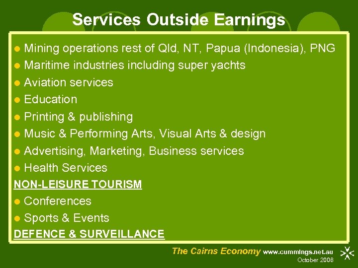 Services Outside Earnings Mining operations rest of Qld, NT, Papua (Indonesia), PNG l Maritime industries including super yachts l Aviation services l Education l Printing & publishing l Music & Performing Arts, Visual Arts & design l Advertising, Marketing, Business services l Health Services l NON-LEISURE TOURISM Conferences l Sports & Events l DEFENCE & SURVEILLANCE The Cairns Economy www. cummings. net. au October 2006
