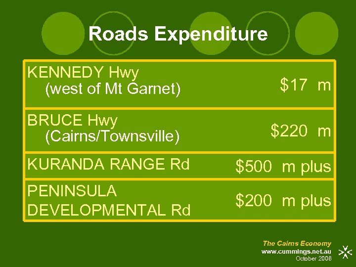 Roads Expenditure KENNEDY Hwy (west of Mt Garnet) $17 m BRUCE Hwy (Cairns/Townsville) $220 m KURANDA RANGE Rd $500 m plus PENINSULA DEVELOPMENTAL Rd $200 m plus The Cairns Economy www. cummings. net. au October 2006