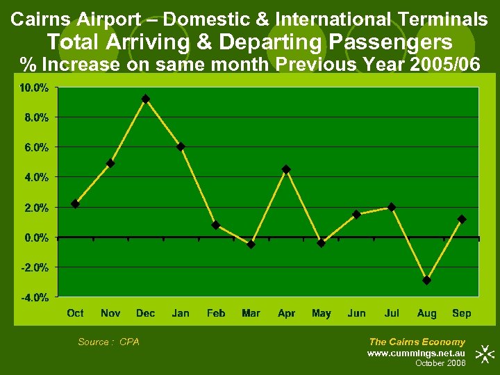Cairns Airport – Domestic & International Terminals Total Arriving & Departing Passengers % Increase on same month Previous Year 2005/06 Source : CPA The Cairns Economy www. cummings. net. au October 2006