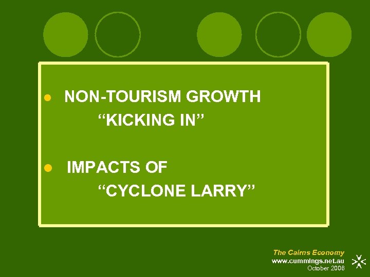 l NON-TOURISM GROWTH “KICKING IN” l IMPACTS OF “CYCLONE LARRY” The Cairns Economy www. cummings. net. au October 2006