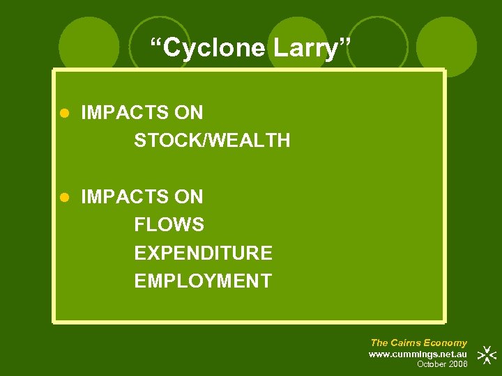 “Cyclone Larry” l IMPACTS ON STOCK/WEALTH l IMPACTS ON FLOWS EXPENDITURE EMPLOYMENT The Cairns Economy www. cummings. net. au October 2006