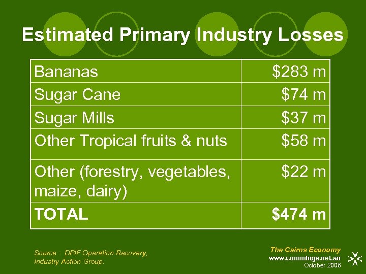 Estimated Primary Industry Losses Bananas Sugar Cane Sugar Mills Other Tropical fruits & nuts $283 m $74 m $37 m $58 m Other (forestry, vegetables, maize, dairy) TOTAL $22 m Source : DPIF Operation Recovery, Industry Action Group. $474 m The Cairns Economy www. cummings. net. au October 2006