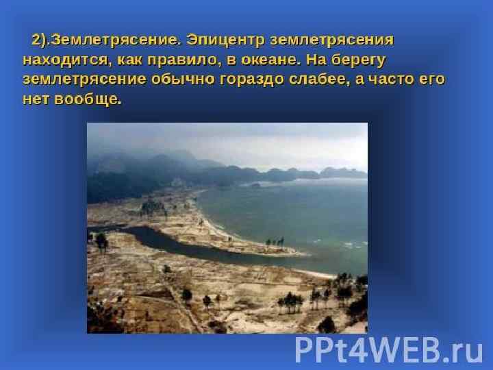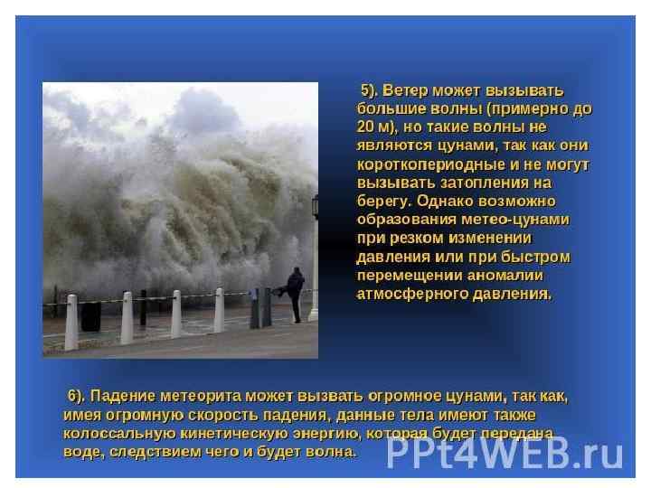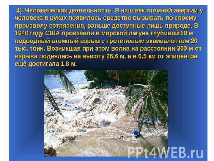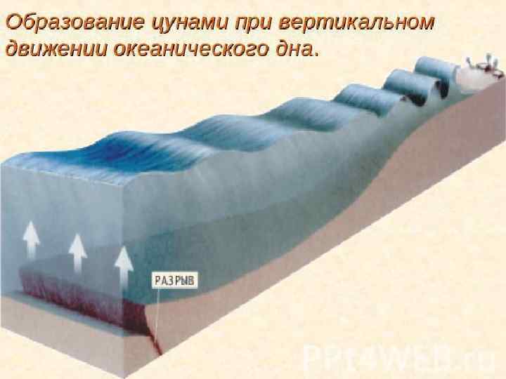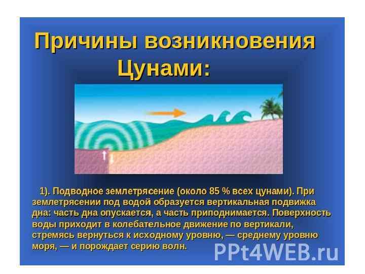 Причины возникновения цунами: • Подводные землетрясения (85% случаев): часть дна поднимается, а часть опускается • Оползни – 7% • Вулканические подводные извержения – 5% • Человеческая деятельность – военные испытания и т. д. • Сильные ветер • Падение метеорита