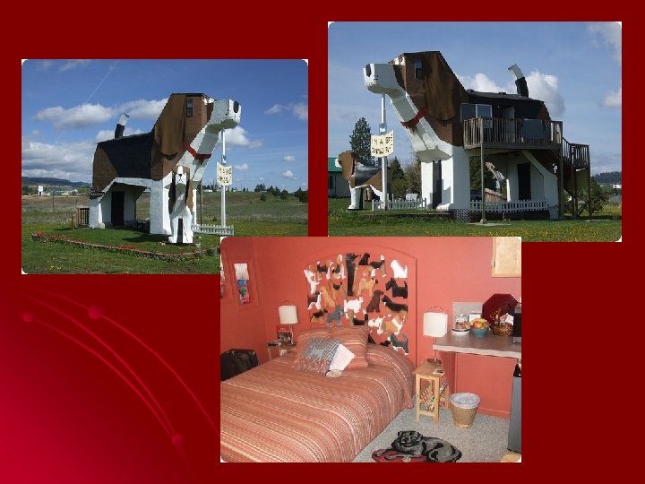 4. Dog Bark Park Inn (Cottonwood, Idaho, Etats-Unis) l Un bed & breakfast construit dans un chien géant (un beagle), composé de 2 chambres … décorées dans l’univers du chien. Ca se tient. 80€ la nuit.