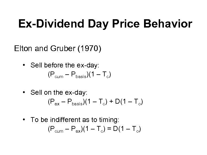 Ex-Dividend Day Price Behavior Elton and Gruber (1970) • Sell before the ex-day: (Pcum – Pbasis)(1 – Tc) • Sell on the ex-day: (Pex – Pbasis)(1 – Tc) + D(1 – To) • To be indifferent as to timing: (Pcum – Pex)(1 – Tc) = D(1 – To)