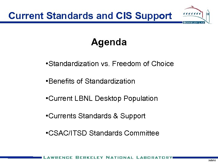 Current Standards and CIS Support Agenda • Standardization vs. Freedom of Choice • Benefits of Standardization • Current LBNL Desktop Population • Currents Standards & Support • CSAC/ITSD Standards Committee 10/5/01