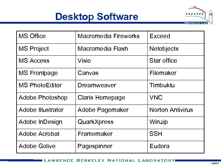 Desktop Software MS Office Macromedia Fireworks Exceed MS Project Macromedia Flash Netobjects MS Access Visio Star office MS Frontpage Canvas Filemaker MS Photo. Editor Dreamweaver Timbuktu Adobe Photoshop Claris Homepage VNC Adobe Illustrator Adobe Pagemaker Norton Antivirus Adobe In. Design Quark. Xpress Winzip Adobe Acrobat Framemaker SSH Adobe Golive Pagespinner Eudora 10/5/01