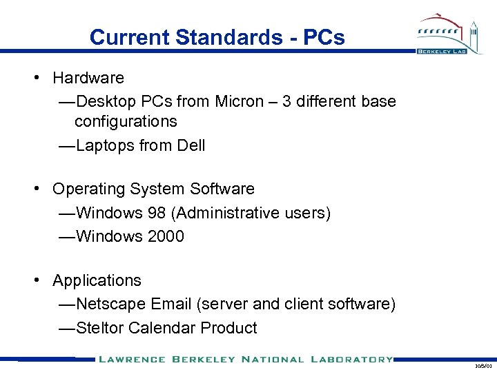 Current Standards - PCs • Hardware —Desktop PCs from Micron – 3 different base configurations —Laptops from Dell • Operating System Software —Windows 98 (Administrative users) —Windows 2000 • Applications —Netscape Email (server and client software) —Steltor Calendar Product 10/5/01