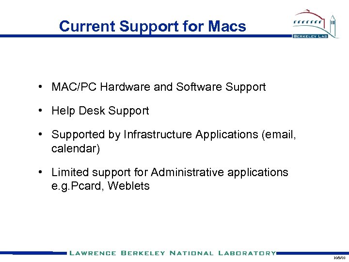 Current Support for Macs • MAC/PC Hardware and Software Support • Help Desk Support • Supported by Infrastructure Applications (email, calendar) • Limited support for Administrative applications e. g. Pcard, Weblets 10/5/01