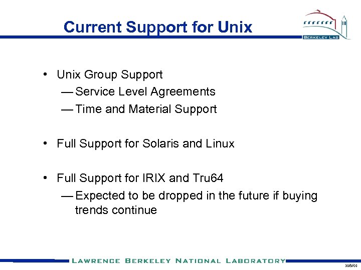 Current Support for Unix • Unix Group Support — Service Level Agreements — Time and Material Support • Full Support for Solaris and Linux • Full Support for IRIX and Tru 64 — Expected to be dropped in the future if buying trends continue 10/5/01