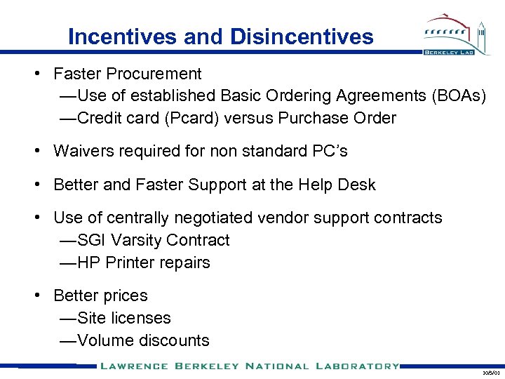 Incentives and Disincentives • Faster Procurement —Use of established Basic Ordering Agreements (BOAs) —Credit card (Pcard) versus Purchase Order • Waivers required for non standard PC’s • Better and Faster Support at the Help Desk • Use of centrally negotiated vendor support contracts —SGI Varsity Contract —HP Printer repairs • Better prices —Site licenses —Volume discounts 10/5/01
