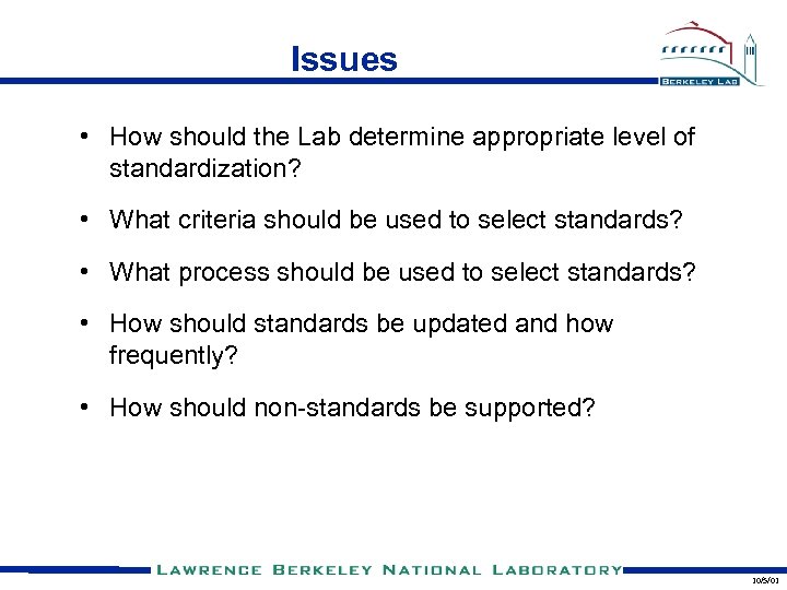Issues • How should the Lab determine appropriate level of standardization? • What criteria should be used to select standards? • What process should be used to select standards? • How should standards be updated and how frequently? • How should non-standards be supported? 10/5/01