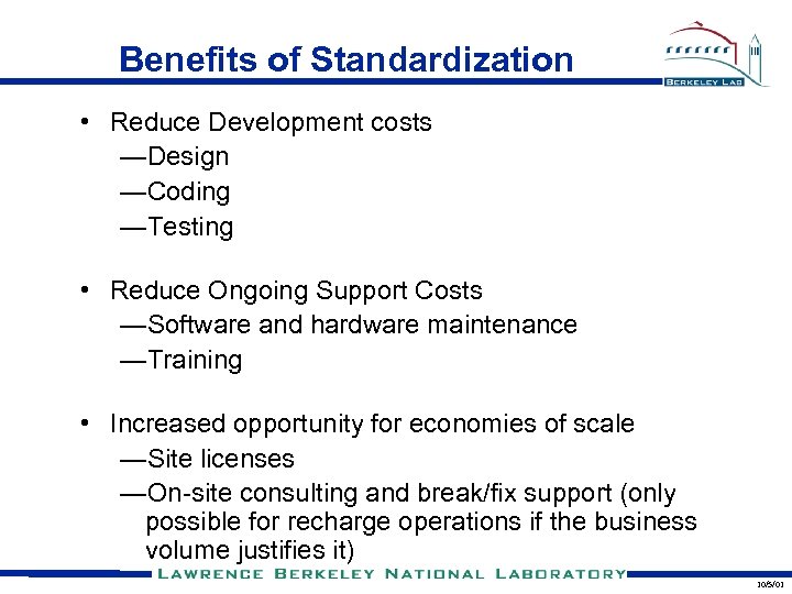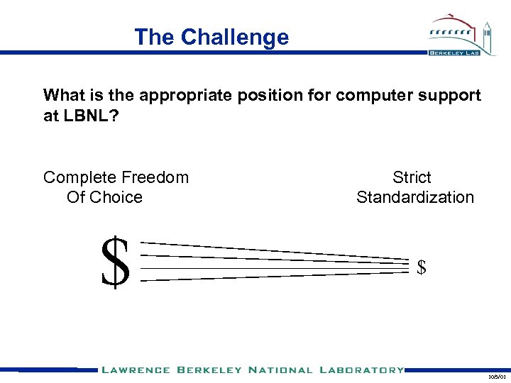 The Challenge What is the appropriate position for computer support at LBNL? Complete Freedom Of Choice $ Strict Standardization $ 10/5/01
