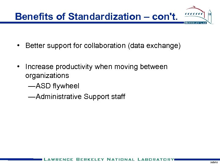 Benefits of Standardization – con't. • Better support for collaboration (data exchange) • Increase productivity when moving between organizations —ASD flywheel —Administrative Support staff 10/5/01