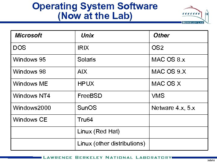 Operating System Software (Now at the Lab) Microsoft Unix Other DOS IRIX OS 2 Windows 95 Solaris MAC OS 8. x Windows 98 AIX MAC OS 9. X Windows ME HPUX MAC OS X Windows NT 4 Free. BSD VMS Windows 2000 Sun. OS Netware 4. x, 5. x Windows CE Tru 64 Linux (Red Hat) Linux (other distributions) 10/5/01