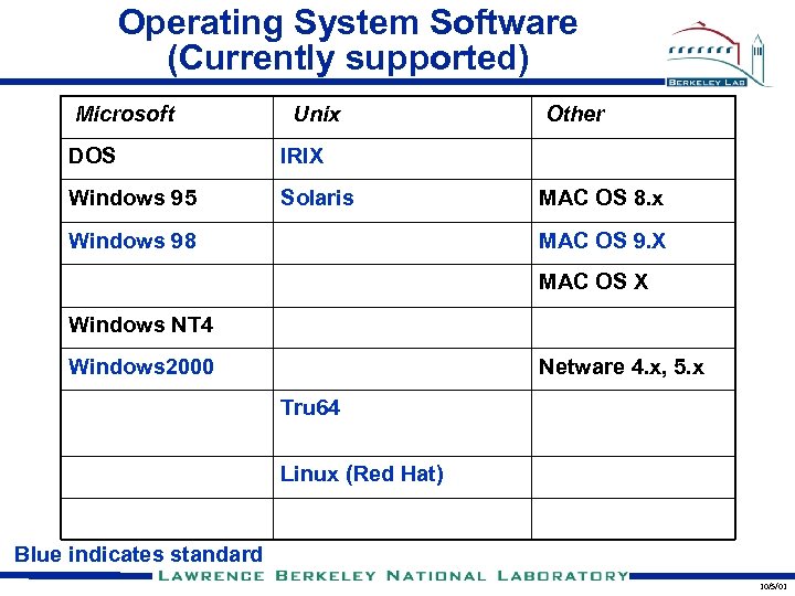 Operating System Software (Currently supported) Microsoft Unix DOS IRIX Windows 95 Solaris Other Windows 98 MAC OS 8. x MAC OS 9. X MAC OS X Windows NT 4 Windows 2000 Netware 4. x, 5. x Tru 64 Linux (Red Hat) Blue indicates standard 10/5/01