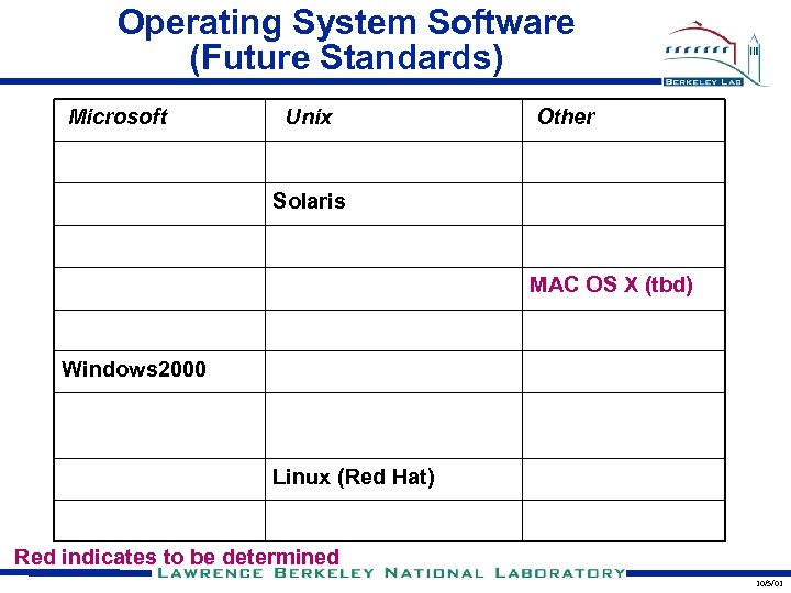 Operating System Software (Future Standards) Microsoft Unix Other Solaris MAC OS X (tbd) Windows 2000 Linux (Red Hat) Red indicates to be determined 10/5/01
