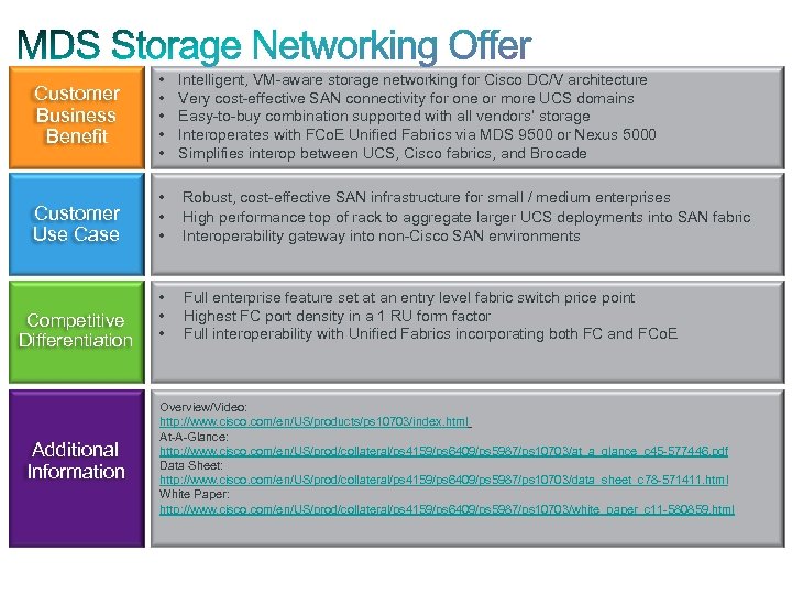 Customer Business Benefit • • • Intelligent, VM-aware storage networking for Cisco DC/V architecture Very cost-effective SAN connectivity for one or more UCS domains Easy-to-buy combination supported with all vendors’ storage Interoperates with FCo. E Unified Fabrics via MDS 9500 or Nexus 5000 Simplifies interop between UCS, Cisco fabrics, and Brocade Customer Use Case • • • Robust, cost-effective SAN infrastructure for small / medium enterprises High performance top of rack to aggregate larger UCS deployments into SAN fabric Interoperability gateway into non-Cisco SAN environments Competitive Differentiation • • • Full enterprise feature set at an entry level fabric switch price point Highest FC port density in a 1 RU form factor Full interoperability with Unified Fabrics incorporating both FC and FCo. E Additional Information Overview/Video: http: //www. cisco. com/en/US/products/ps 10703/index. html At-A-Glance: http: //www. cisco. com/en/US/prod/collateral/ps 4159/ps 6409/ps 5987/ps 10703/at_a_glance_c 45 -577446. pdf Data Sheet: http: //www. cisco. com/en/US/prod/collateral/ps 4159/ps 6409/ps 5987/ps 10703/data_sheet_c 78 -571411. html White Paper: http: //www. cisco. com/en/US/prod/collateral/ps 4159/ps 6409/ps 5987/ps 10703/white_paper_c 11 -580859. html