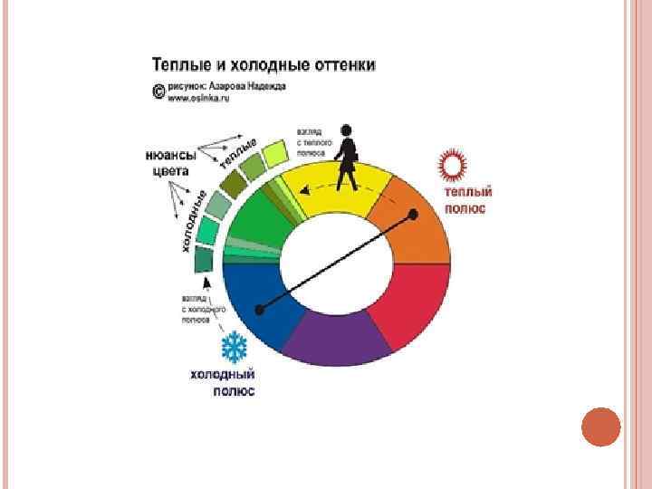 Температура: - Теплые цвета более динамичные, выступающие и объемные, чем холодные. - Холодные цвета кажутся удаляющимися по мере усиления тона. Данная схема НЕ ВЕРНА! Каждый хр. цвет может быть и теплым, и холодным!
