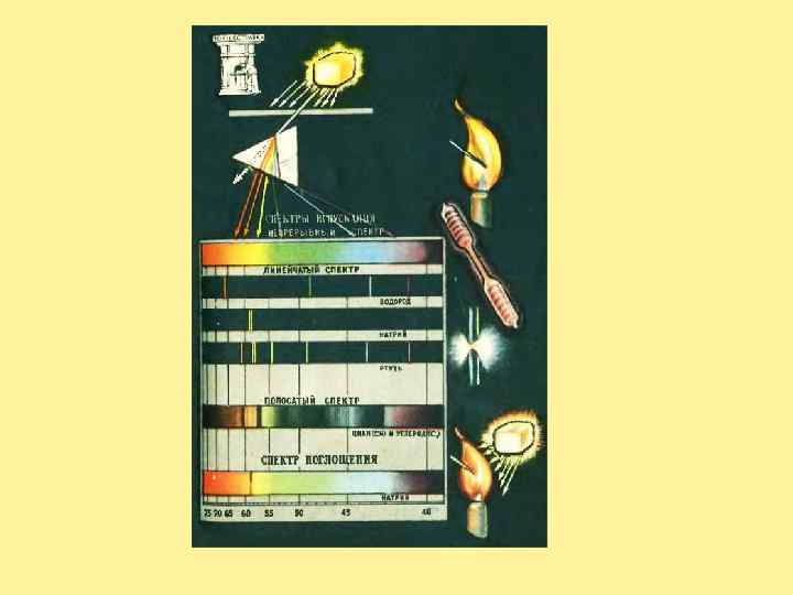 Спектры поглощения получаются при пропускании белого света через пар или газ данного вещества в холодном сос тоянии, вернее , температура газа должна быть ниже температуры источника белого света , при этом холодный газ поглощает именно те лучи , которые он испускает в нагретом состоянии. Так , поверхность Солнца дает сплошной спектр , но солнечная атмосфера поглощает солнечный свет , получается спектр поглощения. Спектры поглощения – это темные линии на фоне сплошного спектра