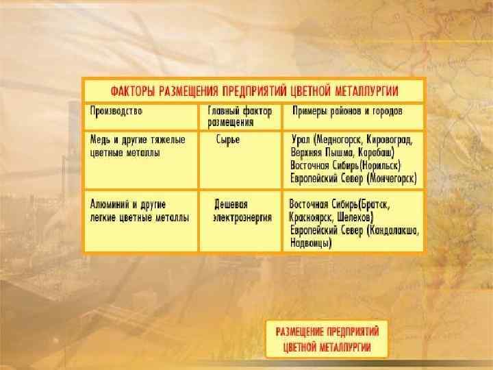 Факторы размещения производства Вид энергии Тепловая Особенность используемой руды Руды цветных металлов содержат не более нескольких % полезного компонента Электрическая Тяжелые металлы