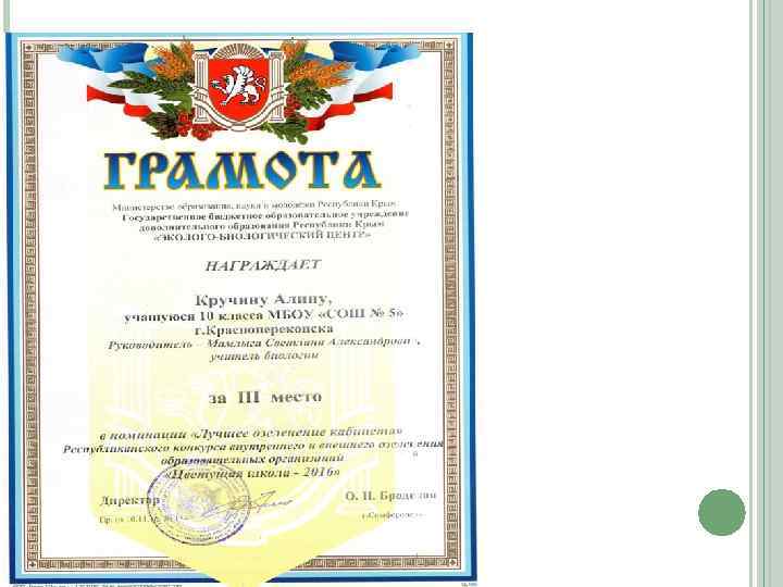 УПРАВЛЕНИЕ ОБРАЗОВАНИЯ АДМИНИСТРАЦИИ ГОРОДА КРАСНОПЕРЕКОПСКА РЕСПУБЛИКИ КРЫМ ПРИКАЗ от 20. 03. 2015 № 162 Об итогах городского смотра–конкурса кабинетов биологии …. . ПРИКАЗЫВАЮ: Считать победителем городского смотра-конкурса кабинет биологии МБОУ «СОШ № 5» (заведующий Мамлыга С. А. ) и присвоить ему статус «Образцовый кабинет» . … Начальник управления образования Н. А. Рудковская