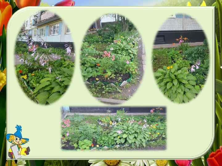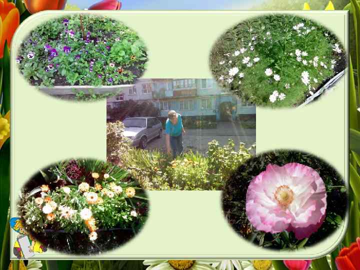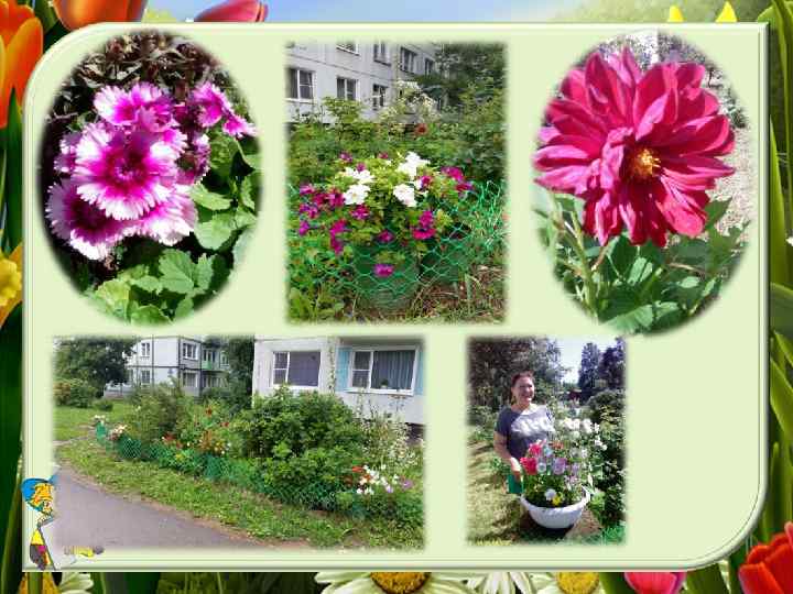 -Татьяна, сколько лет Вы занимаетесь клумбами? -Года три, четыре. Решила разбить клумбы, чтобы из окна видеть не только машины, но и красивый, оформленный цветник. Цветы выращивать трудно, так как им не хватает солнышка в этом месте, приходится постоянно подсыпать землю, так как она «сползает» с клумб. -Татьяна, спасибо Вам, что, не смотря на все трудности, Вы не бросаете это важное дело, и с Вашей помощью двор выглядит красивым и ухоженным!