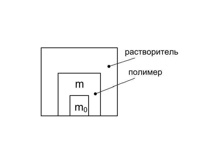 НАБУХАНИЕ Набухание – процесс проникновения молекул растворителя в структуру полимера, сопровождается увеличением объема и массы образца Степень набухания (α) –количественная характеристика процесса набухания: m 0, V 0 – масса и объем образца полимера до набухания; m, V – масса и объем образца полимера после набухания