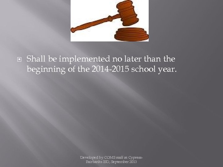 Shall be implemented no later than the beginning of the 2014 -2015 school year. Developed by COMS staff at Cypress. Fairbanks ISD, September 2013