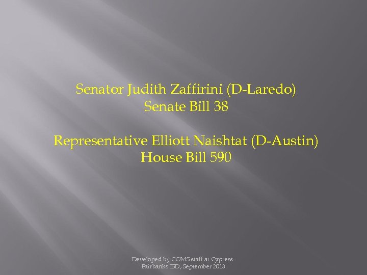 Senator Judith Zaffirini (D-Laredo) Senate Bill 38 Representative Elliott Naishtat (D-Austin) House Bill 590 Developed by COMS staff at Cypress. Fairbanks ISD, September 2013