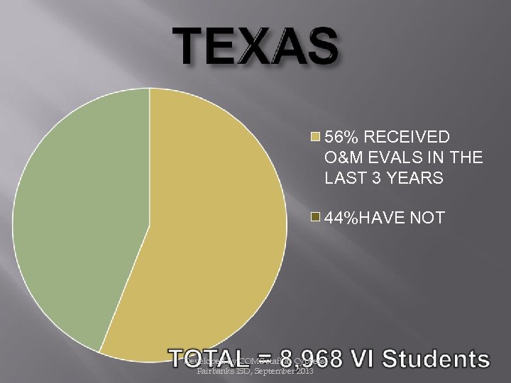 56% RECEIVED O&M EVALS IN THE LAST 3 YEARS 44%HAVE NOT Developed by COMS staff at Cypress. Fairbanks ISD, September 2013