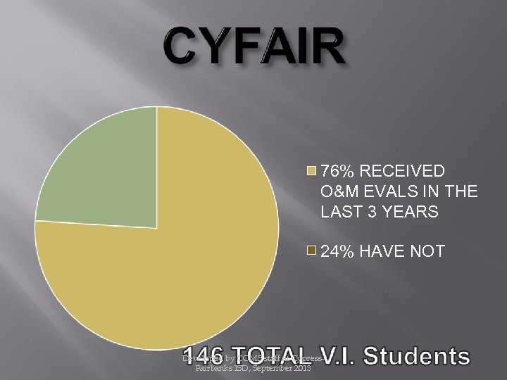 76% RECEIVED O&M EVALS IN THE LAST 3 YEARS 24% HAVE NOT Developed by COMS staff at Cypress. Fairbanks ISD, September 2013
