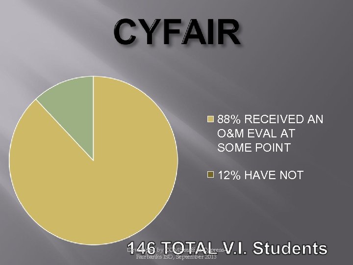 88% RECEIVED AN O&M EVAL AT SOME POINT 12% HAVE NOT Developed by COMS staff at Cypress. Fairbanks ISD, September 2013